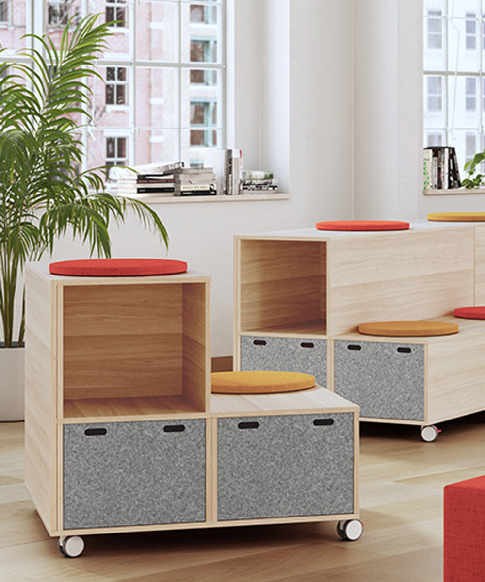 Seating Step es un sistema de gradas con ruedas que fomenta la interacción y participación. Cuenta con módulos rectos y módulo de 90º, permitiendo realizar múltiples configuraciones y aprovechar el entorno al máximo. Funciona como espacio de encuentro dinámico, separador de ambientes y almacenamiento de asientos, mesas auxiliares y otros elementos.