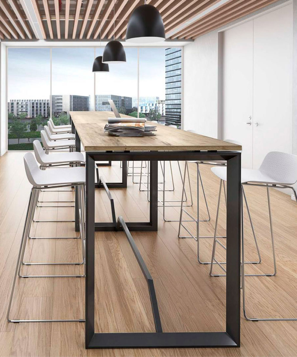 Mesa alta con estructura metálica y reposapiés central.